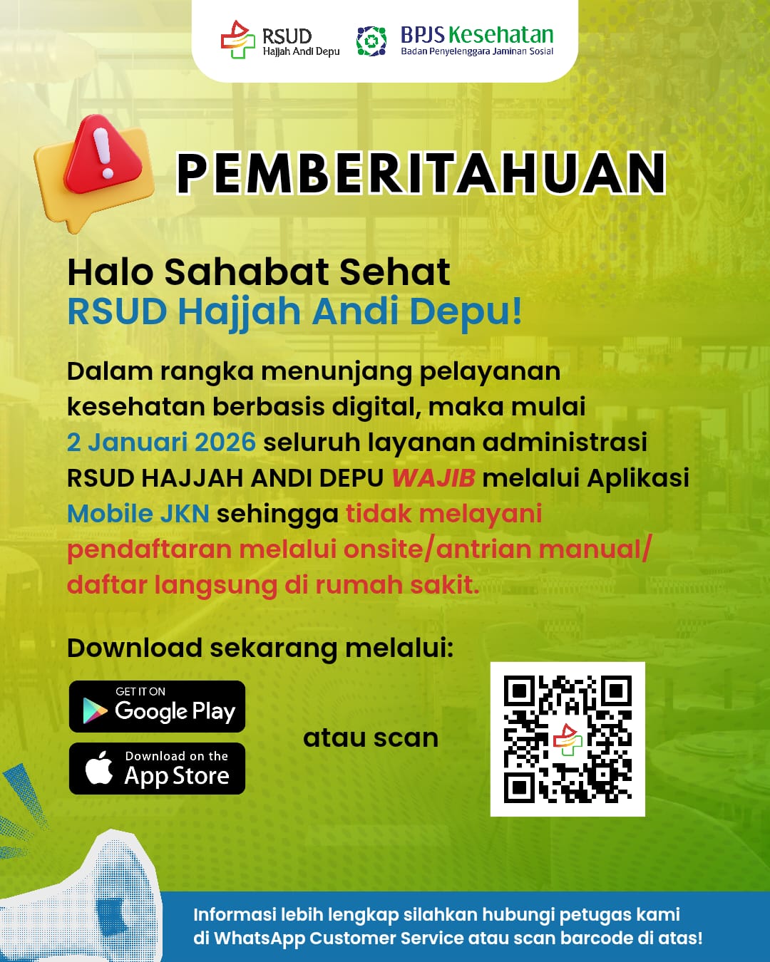Mulai 2 Januari 2026, pengambilan nomor antrian bagi seluruh peserta BPJS Kesehatan dilakukan secara online melalui Aplikasi Mobile JKN sehingga tidak lagi melayani pendaftaran melalui onsite/antrian manual/daftar langsung di rumah sakit.Silahkan gunakan aplikasi Mobile JKN untuk mengambil nomor antrian sebelum datang ke RSUD Hajjah Andi Depu.Apabila mengalami kendala dan tidak bisa mendaftar melalui Mobile JKN termasuk pasien umum dapat menghubungi nomor berikut: +62 851-6737-2755 / +62 895-1363-3368 / +62 878-2242-3925 / +62 821-8944-7573 / +62 857-5746-5189 atau dengan cara scan barcode yang tercantum pada poster di atas.... Selengkapnya...