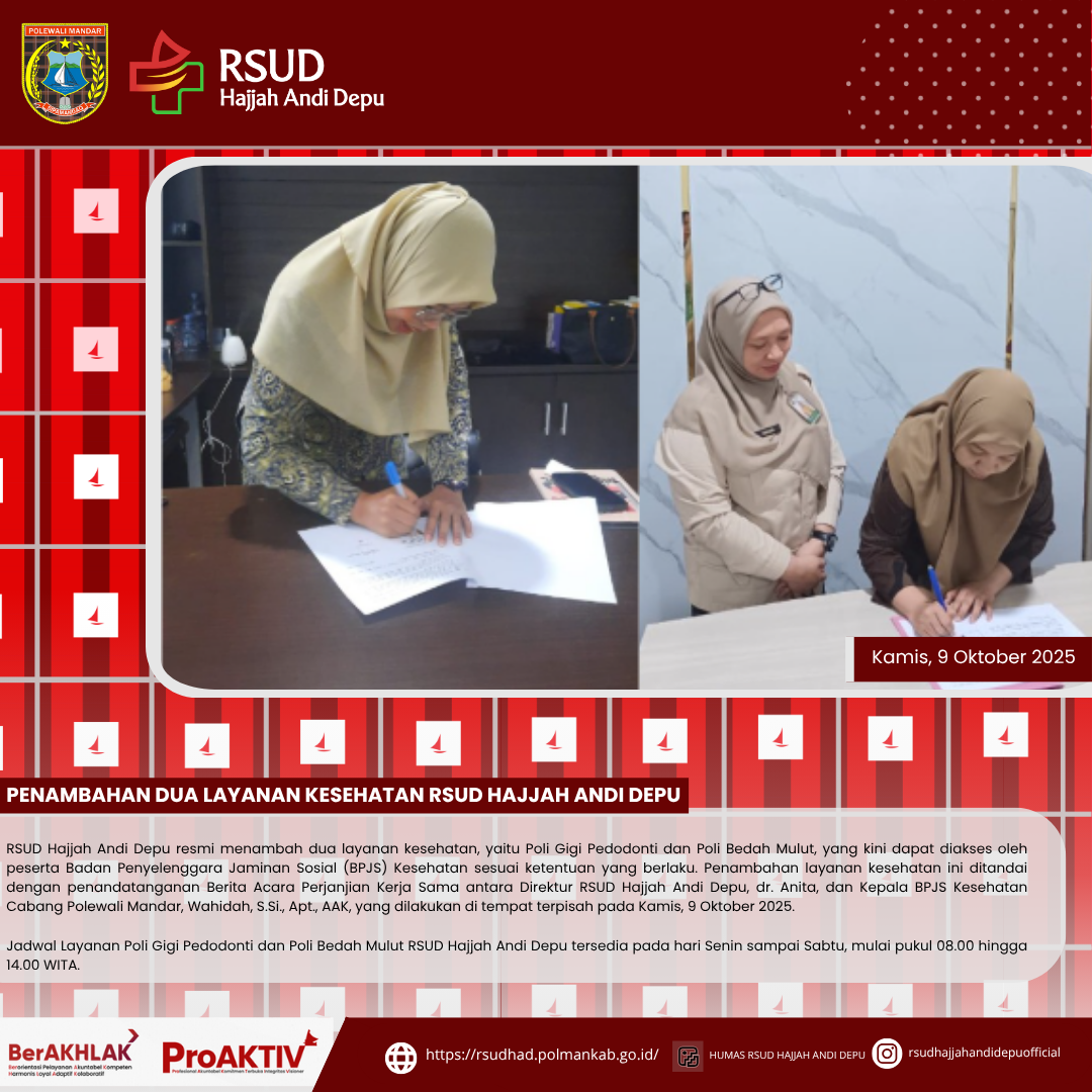 Penambahan Dua Layanan Kesehatan RSUD Hajjah Andi DepuPolewali, 15 Oktober 2025 - RSUD Hajjah Andi Depu resmi menambah dua layanan kesehatan, yaitu Poli Gigi Pedodonti dan Poli Bedah Mulut, yang kini dapat diakses oleh peserta Badan Penyelenggara Jaminan Sosial (BPJS) Kesehatan sesuai ketentuan yang berlaku. Penambahan layanan kesehatan ini ditandai dengan penandatanganan Berita Acara Perjanjian Kerja Sama antara Direktur RSUD Hajjah Andi Depu, dr. Anita, dan Kepala BPJS Kesehatan Cabang Polewali Mandar, Wahidah, S.Si., Apt., AAK, yang dilakukan di tempat terpisah pada Kamis, 9 Oktober 2025.Layanan kesehatan baru ini akan ditangani oleh drg. Harmawaty, Sp. KGA (Dokter Gigi Spesialis Anak) dan drg. Muh. Tegar Jaya, Sp.B.M.M (Dokter Gigi Spesialis Bedah Mulut & Maksilofasial). Penambahan layananan kesehatan merupakan wujud komitmen RSUD Hajjah Andi Depu dalam meningkatkan pelayanan medis untuk masyarakat, khususnya di Kabupaten Polewali Mandar dan sekitarnya. Poli Gigi Pedodonti... Selengkapnya...