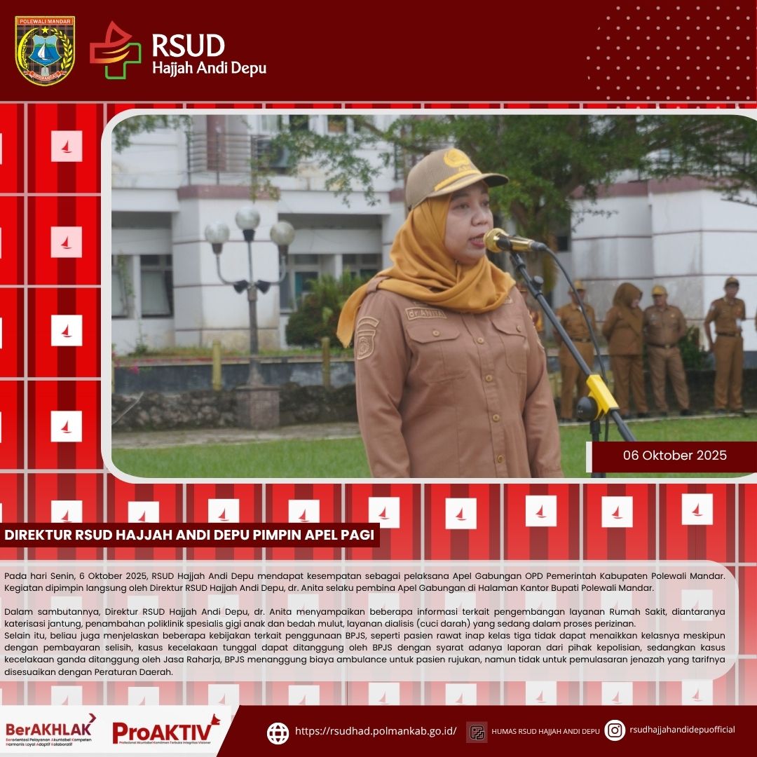 Pada hari Senin, 6 Oktober 2025, RSUD Hajjah Andi Depu mendapat kesempatan sebagai pelaksana Apel Gabungan OPD Pemerintah Kabupaten Polewali Mandar. Kegiatan dipimpin langsung oleh Direktur RSUD Hajja...
