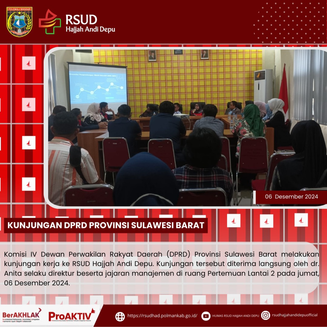 Komisi IV Dewan Perwakilan Rakyat Daerah (DPRD) Provinsi Sulawesi Barat melakukan kunjungan kerja ke RSUD Hajjah Andi Depu. Kunjungan tersebut diterima langsung oleh dr. Anita selaku direktur beserta jajaran manajemen di ruang Pertemuan Lantai 2 pada jumat, 06 Desember 2024.Tujuan kunjungan ini adalah untuk sharing informasi terkait Pengelolaan Manajemen RSUD Hajjah Andi Depu....