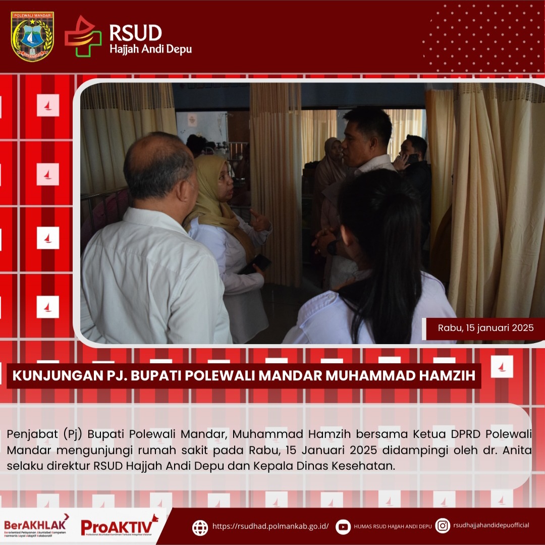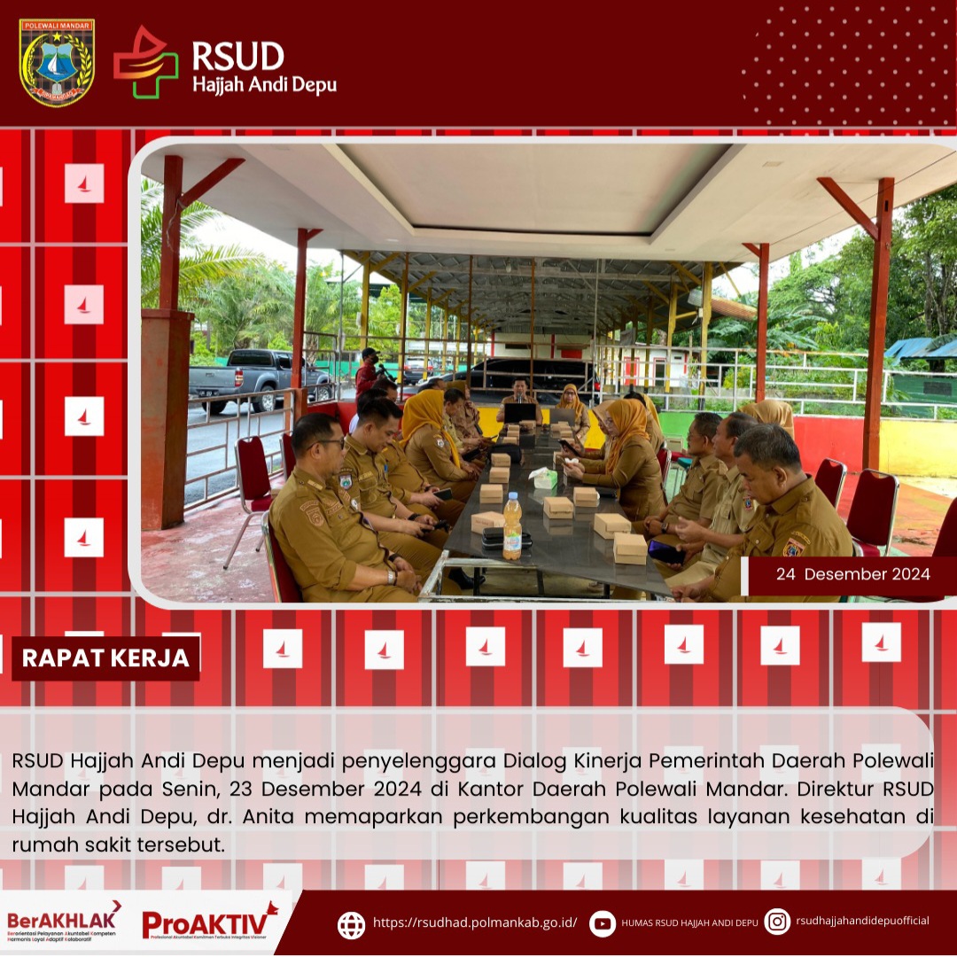RSUD Hajjah Andi Depu menjadi penyelenggara Dialog Kinerja Pemerintah Daerah Polewali Mandar pada Senin, 23 Desember 2024 di Kantor Daerah Polewali Mandar. Direktur RSUD Hajjah Andi Depu, dr. Anita memaparkan perkembangan kualitas layanan kesehatan di rumah sakit tersebut.Dialog Kinerja dipimpin langsung oleh Penjabat Sekretaris Daerah (Pj Sekda) Polewali Mandar dan dihadiri oleh sejumlah pimpinan Organisasi Perangkat Daerah (OPD)....