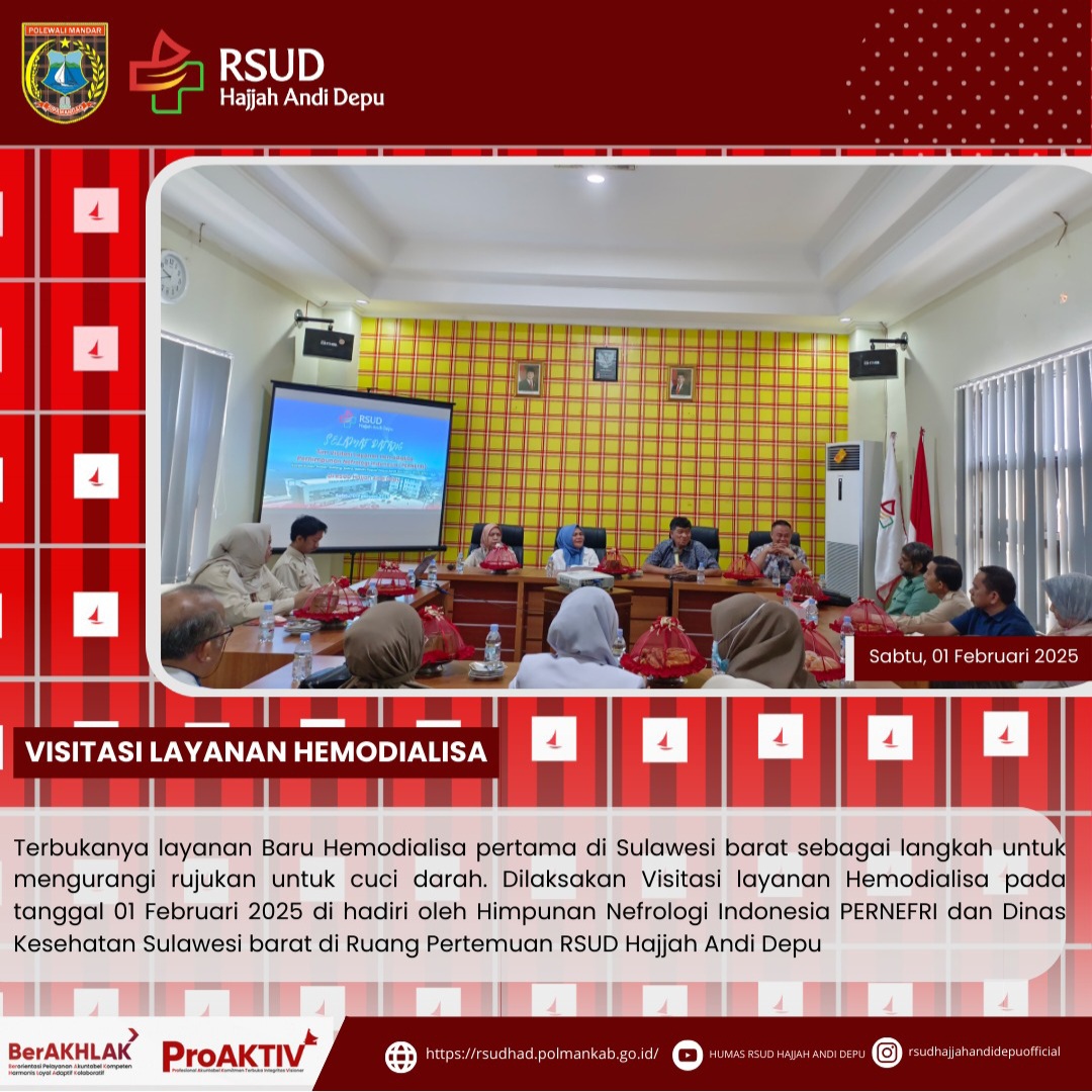 Terbukanya layanan baru Hemodialisa pertama di Sulawesi Barat sebagai langkah untuk mengurangi rujukan untuk cuci darah. Dilaksanakan Visitasi layanan Hemodialisa pada tanggal 01 Februari 2025 di hadiri oleh Himpunan Nefrologi Indonesia PERNEFRI dan Dinas Kesehatan Sulawesi Barat di Ruang Pertemuan RSUD Hajjah Andi Depu....