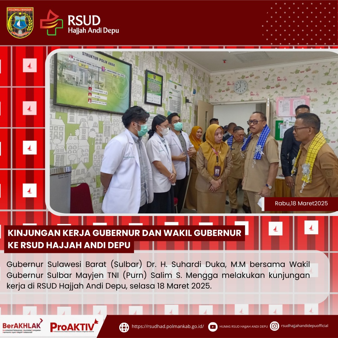 Gubernur Sulawesi Barat (Sulbar) Dr. H. Suhardi Duka, M.M bersama Wakil Gubernur Sulbar Mayjen TNI (Purn) Salim S. Mengga melakukan kunjungan kerja di RSUD Hajjah Andi Depu, selasa 18 Maret 2025.Turut mendampingi Bupati Polewali Mandar H. Samsul Mahmud, Wakil Bupati Polewali Mandar Hj. Andi Nursami Masdar, beberapa kepala OPD Pemprov Sulawesi Barat dan Pemkab Polewali Mandar yang diterima langsung oleh dr. Anita selaku Direktur RSUD Hajjah Andi Depu dan seluruh jajaran rumah sakit.Kunjungan kerj...