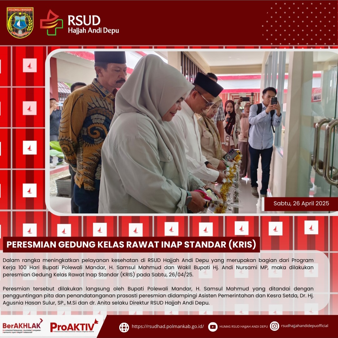 Dalam rangka meningkatkan pelayanan kesehatan di RSUD Hajjah Andi Depu yang merupakan bagian dari Program Kerja 100 Hari Bupati Polewali Mandar, H. Samsul Mahmud dan Wakil Bupati Hj. Andi Nursami MP, maka dilakukan peresmian Gedung Kelas Rawat Inap Standar (KRIS) pada Sabtu, 26/04/25.Peresmian tersebut dilakukan langsung oleh Bupati Polewali Mandar, H. Samsul Mahmud yang ditandai dengan pengguntingan pita dan penandatanganan prasasti peresmian didampingi Asisten Pemerintahan dan Kesra Setda, Dr....