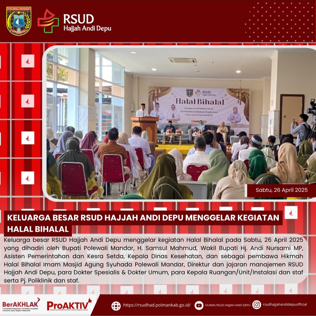 Keluarga besar RSUD Hajjah Andi Depu menggelar kegiatan Halal Bihalal pada Sabtu, 26 April 2025 yang dihadiri oleh Bupati Polewali Mandar, H. Samsul Mahmud, Wakil Bupati Hj. Andi Nursami MP, Asisten Pemerintahan dan Kesra Setda, Kepala Dinas Kesehatan, dan sebagai pembawa Hikmah Halal Bihalal Imam Masjid Agung Syuhada Polewali Mandar, Direktur dan jajaran manajemen RSUD Hajjah Andi Depu, para Dokter Spesialis & Dokter Umum, para Kepala Ruangan/Unit/Instalasi dan staf serta Pj. Poliklinik dan...