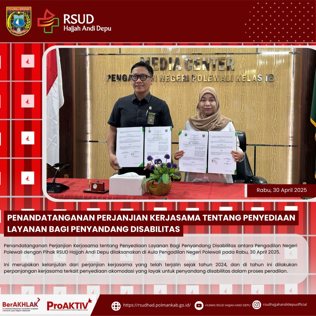 Penandatanganan Perjanjian Kerjasama tentang Penyediaan Layanan Bagi Penyandang Disabilitas antara Pengadilan Negeri Polewali dengan Pihak RSUD Hajjah Andi Depu dilaksanakan di Aula Pengadilan Negeri Polewali pada Rabu, 30 April 2025. Ini merupakan kelanjutan dari perjanjian kerjasama yang telah terjalin sejak tahun 2024, dan di tahun ini dilakukan perpanjangan kerjasama terkait penyediaan akomodasi yang layak untuk penyandang disabilitas dalam proses peradilan....