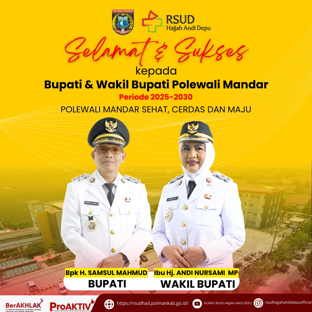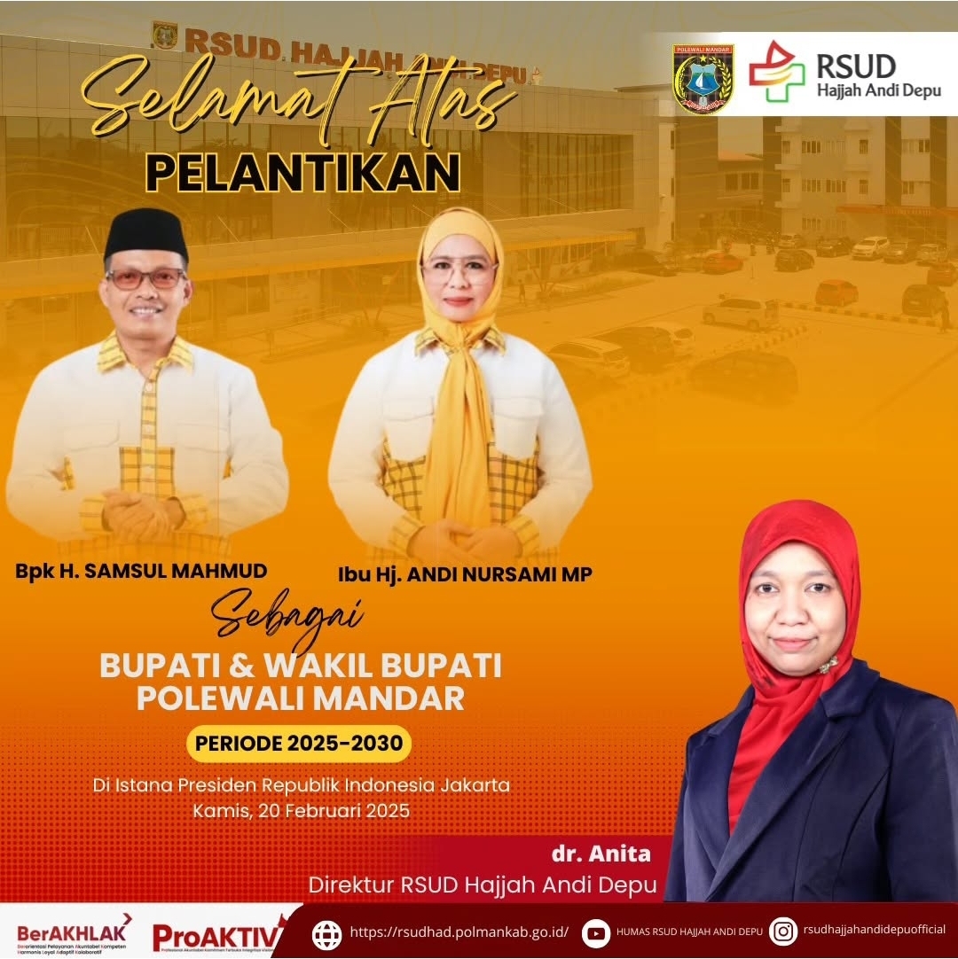 Segenap jajaran RSUD Hajjah Andi Depu mengucapkan selamat atas pelantikan Bapak H. Samsul Mahmud dan Ibu Andi Nursami, MP sebagai Bupati dan Wakil Bupati Polewali Mandar periode 2025-2030. Pelantikan tersebut dilakukan langsung oleh Presiden RI Prabowo Subianto pada Kamis, 20 Februari 2025, pukul 10.00 WIB di Istana Presiden Republik Indonesia, Jakarta....