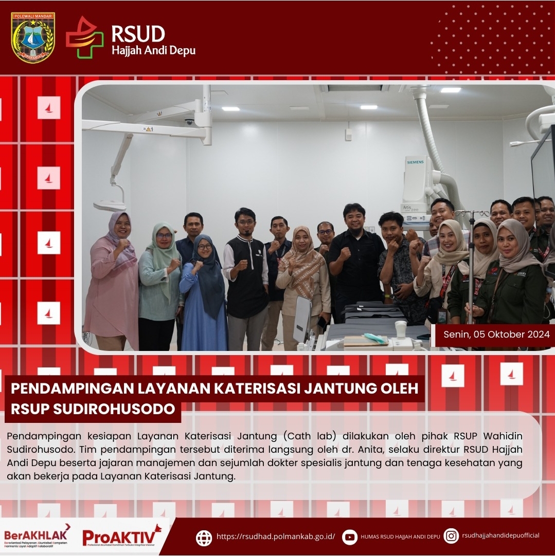 Pendampingan kesiapan Layanan Katerisasi Jantung (Cath lab) dilakukan oleh pihak RSUP Wahidin Sudirohusodo. Tim pendampingan tersebut diterima langsung oleh dr. Anita, selaku direktur RSUD Hajjah Andi Depu beserta jajaran manajemen dan sejumlah dokter spesialis jantung dan tenaga kesehatan yang akan bekerja pada Layanan Katerisasi Jantung....