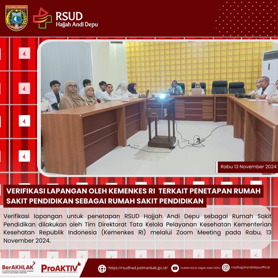 Verifikasi lapangan untuk penetapan RSUD Hajjah Andi Depu sebagai Rumah Sakit Pendidikan dilakukan oleh Tim Direktorat Tata Kelola Pelayanan Kesehatan Kementerian Kesehatan Republik Indonesia (Kemenkes RI) melalui Zoom Meeting pada Rabu, 13 November 2024.Dalam kegiatan ini, dihadiri oleh Tim Assesor dari Kementerian Kesehatan, Asosiasi Rumah Sakit Pendidikan Indonesia (ARSPI), Asosiasi Institusi Pendidikan Kedokteran Indonesia (AIPKI), Direktur RSUD Hajjah Andi Depu beserta tim kerja Rumah Sakit...