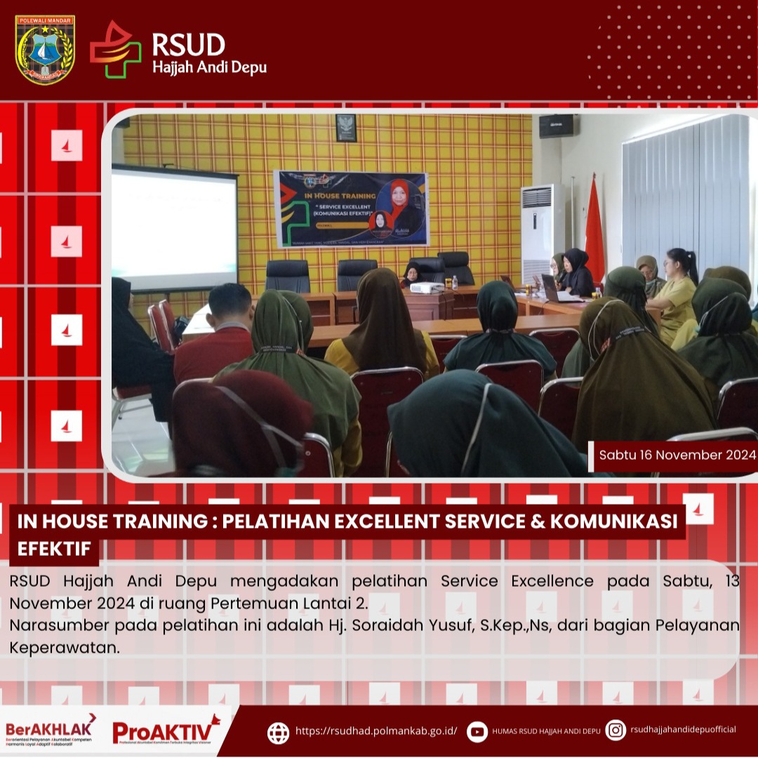 RSUD Hajjah Andi Depu mengadakan pelatihan Service Excellence pada Sabtu, 16 November 2024 di ruang Pertemuan Lantai 2. Narasumber pada pelatihan ini adalah Hj. Soraidah Yusuf, S.Kep.,Ns, dari bagian Pelayanan Keperawatan.Tujuan dari in-house training ini adalah meningkatkan mutu pelayanan melalui Service Excellence dan komunikasi efektif bagi seluruh petugas RSUD Hajjah Andi Depu, sehingga dapat menciptakan kenyamanan pelayanan yang prima bagi pasien....