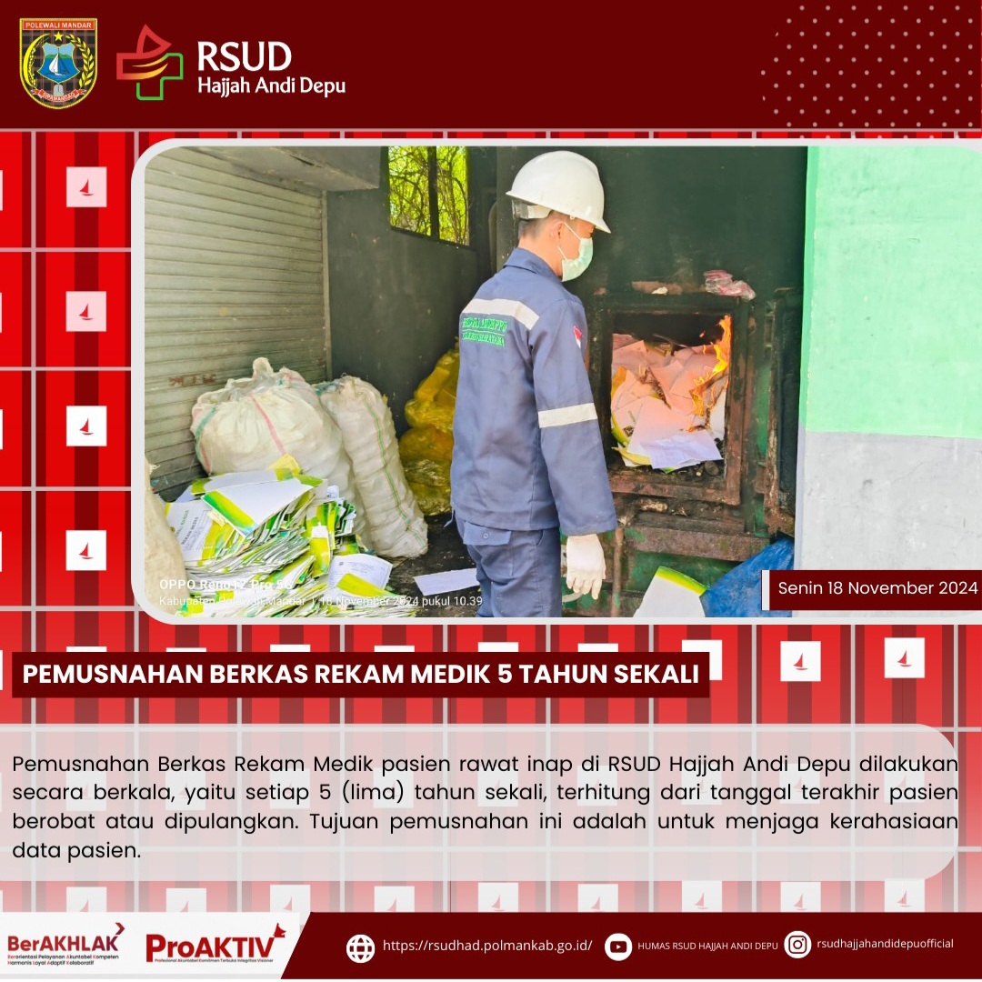 Pemusnahan Berkas Rekam Medik pasien rawat inap di RSUD Hajjah Andi Depu dilakukan secara berkala, yaitu setiap 5 (lima) tahun sekali, terhitung dari tanggal terakhir pasien berobat atau dipulangkan. Tujuan pemusnahan ini adalah untuk menjaga kerahasiaan data pasien.Pemusnahan Berkas Rekam Medik tersebut dilakukan melalui proses pembakaran dan diawasi langsung oleh pejabat perwakilan dari Dinas Perpustakaan dan Kearsipan, pada Senin (18/11/2024)....