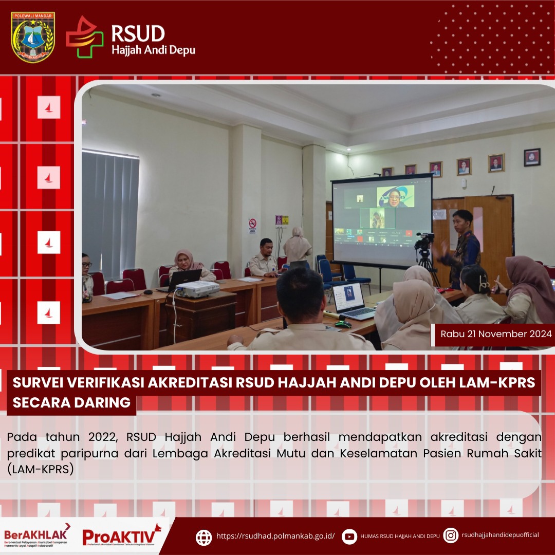 Pada tahun 2022, RSUD Hajjah Andi Depu berhasil mendapatkan akreditasi dengan predikat paripurna dari Lembaga Akreditasi Mutu dan Keselamatan Pasien Rumah Sakit (LAM-KPRS)LAM-KPRS kembali melaksanakan survei verifikasi akreditasi di RSUD Hajjah Andi Depu pada tanggal 21 November 2024. Survei verifikasi akreditasi kali ini dilakukan secara daring melalui Zoom Meeting oleh surveyor (Ners. Saridawati, S.Kep) yang berlangsung selama 2 (dua) hari....