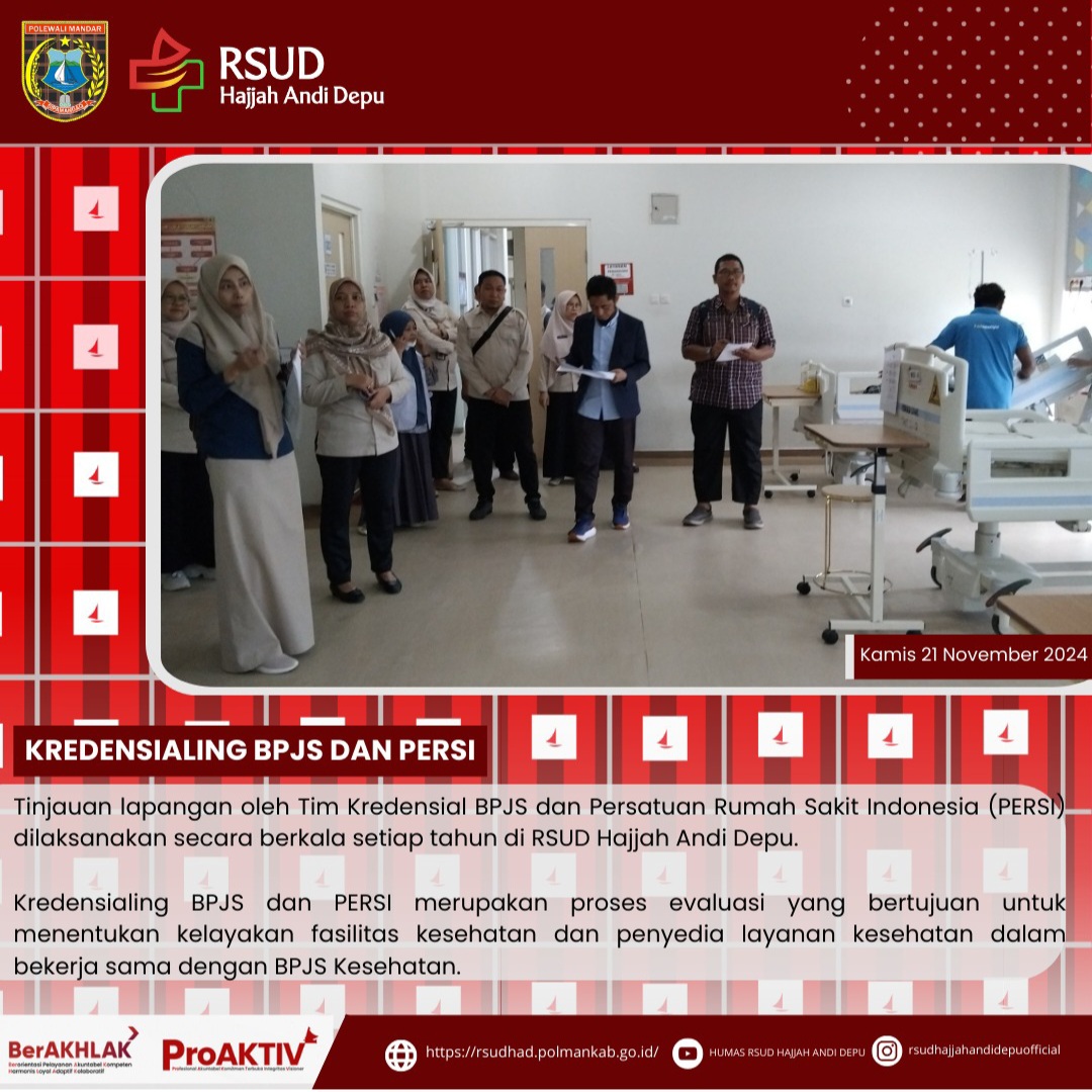 Tinjauan lapangan oleh Tim Kredensial BPJS dan Persatuan Rumah Sakit Indonesia (PERSI) dilaksanakan secara berkala setiap tahun di RSUD Hajjah Andi Depu. Kredensialing BPJS dan PERSI merupakan proses evaluasi yang bertujuan untuk menentukan kelayakan fasilitas kesehatan dan penyedia layanan kesehatan dalam bekerja sama dengan BPJS Kesehatan.Dalam peninjauan lapangan di RSUD Hajjah Andi Depu, Tim Kredensial BPJS dan PERSI melakukan peninjauan terhadap berbagai fasilitas dan layanan yang ada....