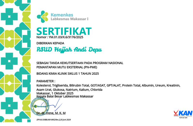 Rabu, 29 Oktober 2025, Labkesmas Makassar I memberikan sertifikat kepada RSUD Hajjah Andi Depu sebagai tanda keikutsertaan pada Program Nasional Pemantapan Mutu Eksternal (PN-PME) yang mencakup bidang Hematologi dan Kimia Klinik siklus 1 Tahun 2025.